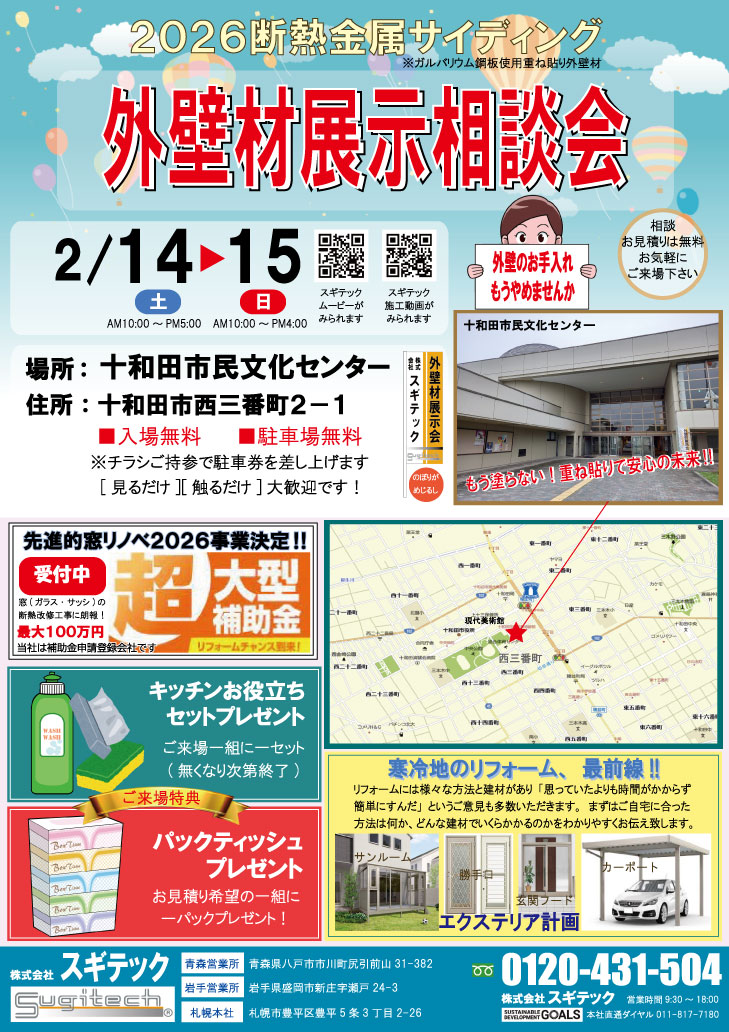 【十和田市】令和8年2月14日(土)、15日(日)十和田市民文化センターにて金属サイディング外壁材展示リフォーム相談会