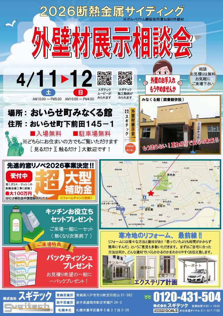 【上北郡】4月11日(土)、12日(日)おいらせ町みなくる館にて金属サイディング外壁材展示リフォーム相談会
