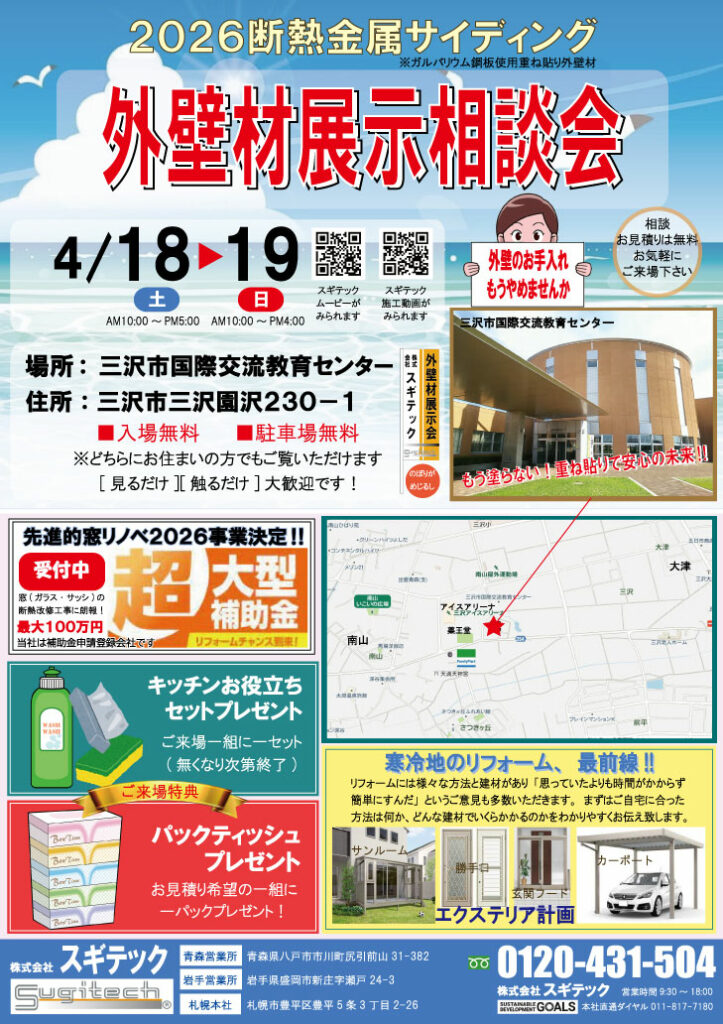 【三沢市】4月18日(土)、19日(日)国際交流教育センターにて金属サイディング外壁材展示リフォーム相談会
