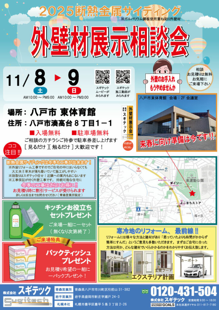 【八戸市】11月8日(土)、9日(日)は東体育館にて金属サイディング外壁材展示リフォーム相談会