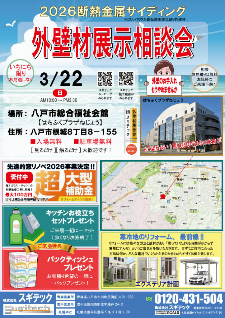 【八戸市】3月22日(日)八戸市総合福祉会館(はちふくプラザねじょう)にて金属サイディング外壁材展示リフォーム相談会
